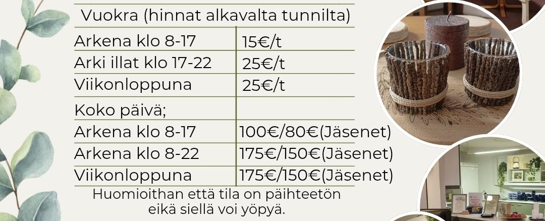 Tiloja voi vuokrata edulliseen tuntihintaan tai koko päiväksi (alv. 0%, maksu laskulla). Maksu peritään alkavasta tunnista ja laskutetaan tasatunteina. Hinnat ylläolevassa kuvassa.